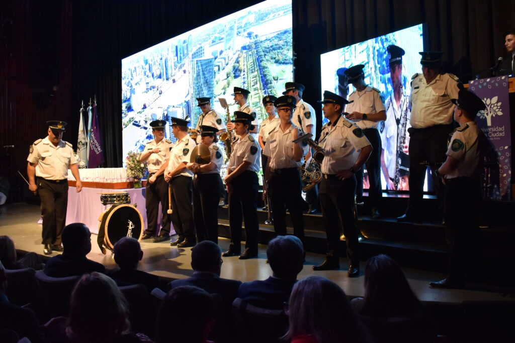 Al comenzar la ceremonia, que contó con la presencia de la ministra de Educación de la Ciudad Mercedes Miguel, ingresaron las banderas de ceremonia y se entonaron las estrofas del Himno Nacional, interpretadas por el tenor del Teatro Colón Marcelo Gómez, junto con la Banda de la Policía de la Ciudad de Buenos Aires, dirigida por Jorge Zervín.